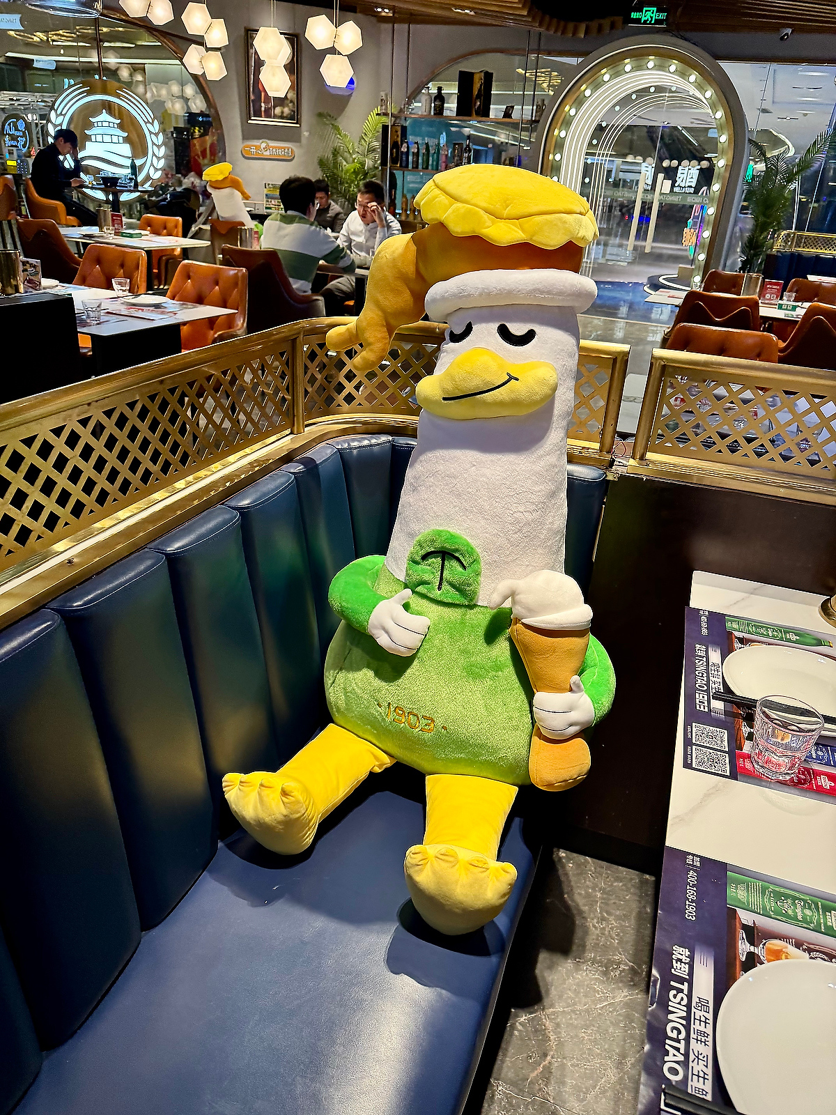 E poi, naturalmente, c’è la birra. Tsingtao fu fondata nel 1903 da imprenditori tedeschi e britannici. Oggi è il secondo produttore nazionale, ma il museo storico — ospitato nell’ex stabilimento — conserva ancora i grandi fermentatori in rame, le bottiglie d’epoca e perfino la mascotte ufficiale: una buffa “anatra della birra”, la 啤酒鸭 (píjiǔ yā), scelta anche per l’assonanza con 啤酒呀 (píjiǔ ya – “birra, eh?”), frase colloquiale che accompagna un brindisi scherzoso.