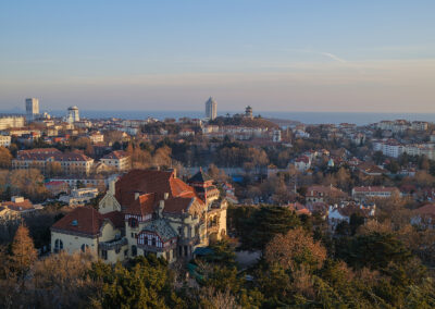 La casa del governatore, con un’architettura eclettica tra Jugendstil e periodo guglielmino, incarna sia la cultura orientale che il linguaggio architettonico classico, ospita un elegante e grande giardino d’inverno con soffitto in vetro apribile meccanicamente.