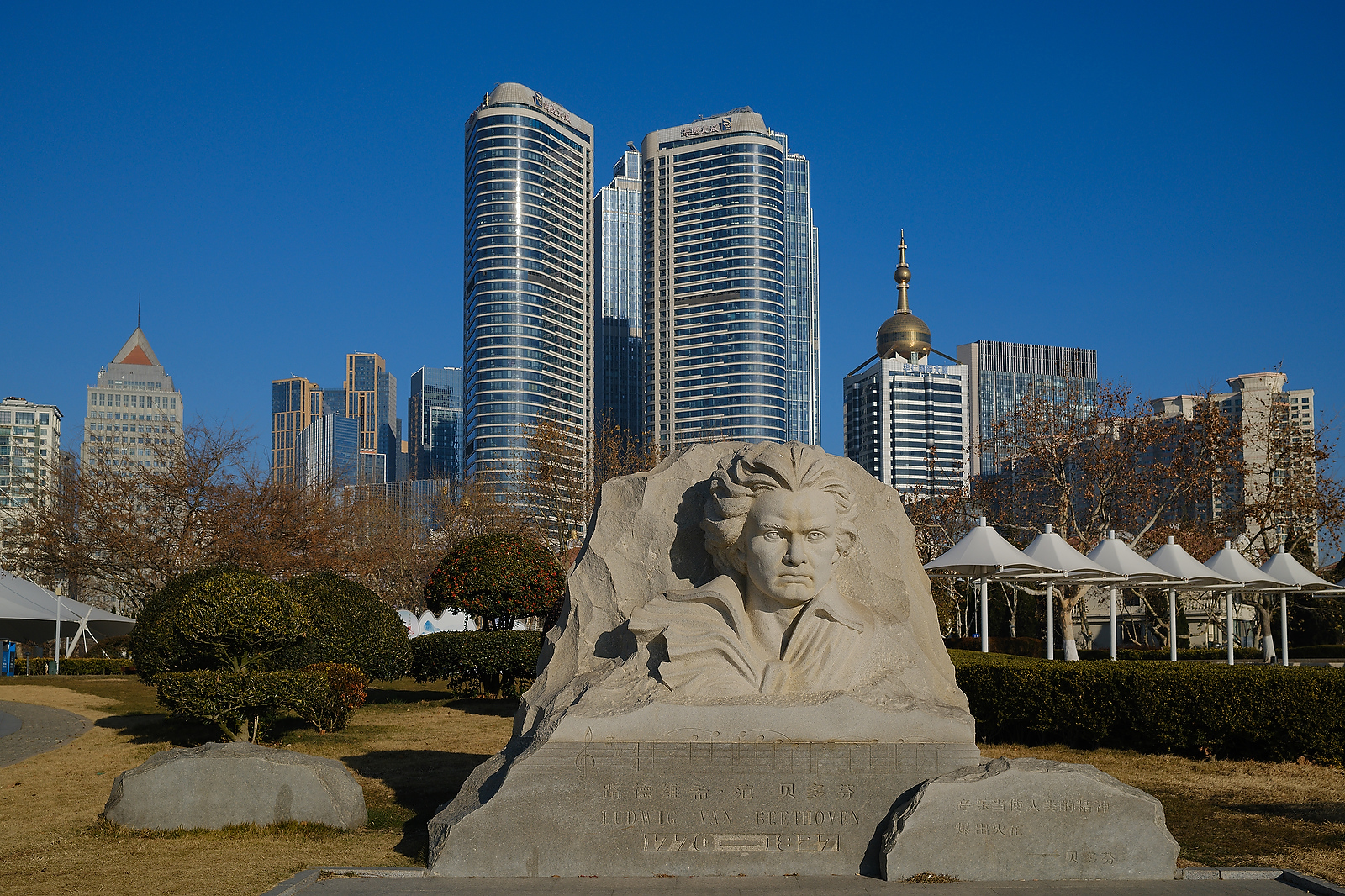 Nella piazza della Musica, dove si può trovare il pentagramma dell’inno cinese sulla pavimentazione, non si può far a meno di notare una statua in pietra chiara raffigurante Beethoven, il compositore tedesco sembra guardare silenziosamente verso il mare.